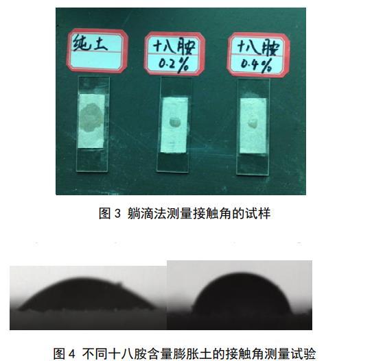目前測(cè)量粉體接觸角(包括土顆粒)的方法主要有3種:躺滴法、毛細(xì)管上升法和Wilhelmy平板法,其中,躺滴法測(cè)出的接觸角為介于前進(jìn)接觸角和后退接觸角之間的表觀接觸角,毛細(xì)管上升法測(cè)出的接觸角為前進(jìn)接觸角,Wilhelmy平板法測(cè)出的接觸角為前進(jìn)接觸角或后退接觸角。土體開(kāi)裂是一個(gè)相對(duì)較慢的過(guò)程,因此土顆粒與孔隙水的接觸角大部分時(shí)間應(yīng)該處于前進(jìn)接觸和后退接觸角之間的某一表觀接觸角。所以,本文采用躺滴法對(duì)土顆粒接觸角進(jìn)行測(cè)量。土樣烘干后過(guò)0.075 mm的篩,取長(zhǎng)度為4 cm左右的雙面膠帶貼到載玻片上,將篩好的土顆粒均勻覆蓋載玻片,并用重量為200 g的砝碼壓住載玻片,持續(xù)時(shí)間為2 min,移開(kāi)砝碼后反復(fù)輕輕磕碰載玻片以去除多余的土顆粒,直到膠帶表面覆蓋有一層薄薄的土顆粒,且土顆粒分布均勻無(wú)明顯凸起。如圖3所示,當(dāng)水滴滴到被純土覆蓋的膠帶上時(shí),液滴迅速擴(kuò)散開(kāi),此時(shí)土顆粒的親水性很好,接觸角趨近于0。水滴滴到另外兩個(gè)覆蓋著混有十八胺土樣的載玻片時(shí),形成了小液滴,此時(shí)固–液界面和氣–液界面之間的夾角不為0,把這2塊載玻片分別放到試驗(yàn)臺(tái)上進(jìn)行液滴在土顆粒表面的表觀接觸角測(cè)量,液滴初始體積為5μL,測(cè)量?jī)x器為JC2000型接觸角測(cè)量?jī)x,如圖4所示,每個(gè)土樣的接觸角反復(fù)測(cè)量5次后取平均值。十八胺含量為0.2%土樣的接觸角為30.5°,十八胺含量為0.4%土樣的接觸角為60.2°。