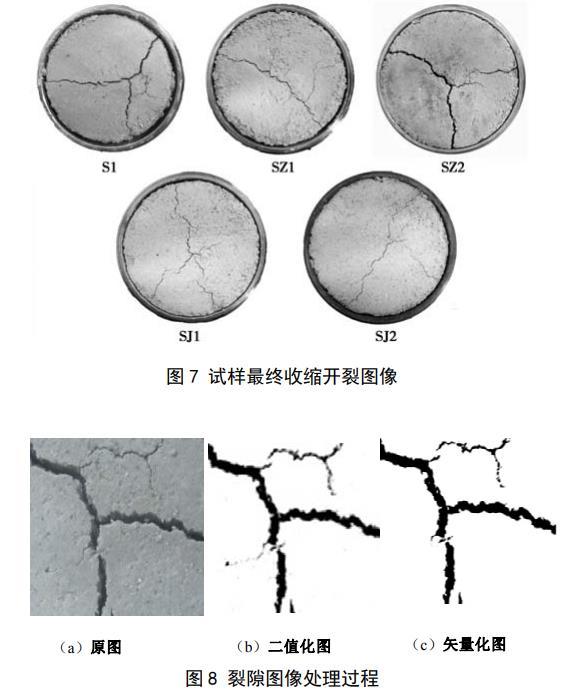 圖7給出了5個(gè)試樣在脫濕結(jié)束后對(duì)應(yīng)的收縮開(kāi)裂圖像。從圖中可以看出,每個(gè)試樣均出現(xiàn)了不同程度的收縮裂隙,各試樣表面裂隙最終形態(tài)具有大致相似的規(guī)律:3條裂隙相交于一點(diǎn),把圓形表面分成了3個(gè)部分,S1樣和SZ2樣的裂隙較寬,試樣開(kāi)裂明顯,其余試樣裂隙發(fā)育不明顯,裂隙在形成過(guò)程中先形成一條主裂隙,主裂隙發(fā)育過(guò)程中支裂隙開(kāi)始發(fā)育,最終支裂隙和主裂隙相交形成3條裂隙。S1樣和SZ1樣不僅出現(xiàn)了裂隙,在試樣和鋼環(huán)接觸的地方還出現(xiàn)了明顯的分離,試樣出現(xiàn)了體縮,其余試樣也出現(xiàn)了不同程度的體縮,但并不明顯。為得到試樣的裂隙度,先要對(duì)采集到的試驗(yàn)開(kāi)裂圖片進(jìn)行圖像處理,如圖8所示,先對(duì)采集到的膨脹土干縮過(guò)程圖像進(jìn)行二值化,去除一些非裂隙雜點(diǎn),再把二值化圖像進(jìn)行矢量化,矢量化后的圖像通過(guò)AUTOCAD提取試樣收縮面積和裂隙面積,最后計(jì)算出試樣的收縮開(kāi)裂裂隙度: