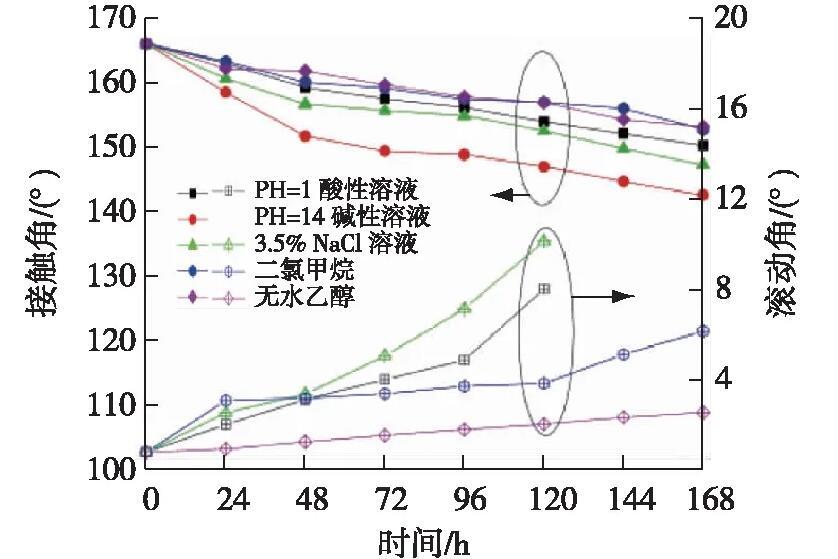 由圖4可知,超疏涂層在無(wú)水乙醇和二氯甲烷中浸泡168 h后仍然保持超疏水性能;在pH=1的酸性溶液和質(zhì)量分?jǐn)?shù)3.5%的NaCl溶液中浸泡120 h后與水仍然保持超疏性能。但在pH=14的堿性溶液中浸泡48 h后接觸角低于150°且已無(wú)法滾動(dòng)。這說(shuō)明涂層具有較好的耐酸、耐鹽水和耐溶劑性能,但是耐堿性欠佳。