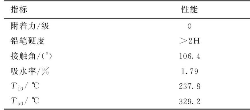 由表1可見(jiàn),含氟聚氨酯固化膜和玻璃基材之間的附著力達(dá)到0級(jí),鉛筆硬度大于2H。FPU薄膜與水的靜態(tài)接觸角為106.4°,遠(yuǎn)高于不含氟的聚氨酯膜。本研究的FPU薄膜在浸泡24 h后吸水率趨于平衡,泡水200 h后吸水率不高于1.79%,遠(yuǎn)低于一般的聚氨酯的5%吸水率。歸因于C—F鏈段具有很低的表面張力,會(huì)自發(fā)地向表面遷移并富集,降低了表面張力,提高了材料的憎水性。除此之外,從表1中還可知FPU的T10和T50分別為237.8和329.2℃。與一般聚氨酯材料相比,F(xiàn)PU的熱穩(wěn)定性沒(méi)有很大程度的提升。