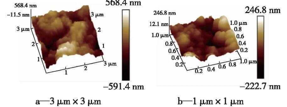眾所周知,表面微結(jié)構(gòu)形貌在增強(qiáng)表面超疏性能方面起著重要作用。圖2是超疏涂層的SEM圖像,圖3是超疏涂層的AFM圖像。