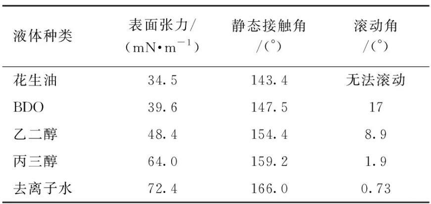 表2不同表面張力液體在超疏涂層上的接觸角和滾動(dòng)角
