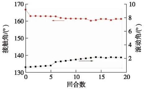 圖5為超疏涂層在經(jīng)過(guò)19次磨損的每次磨損周期后對(duì)水的接觸角和滾動(dòng)角變化情況。