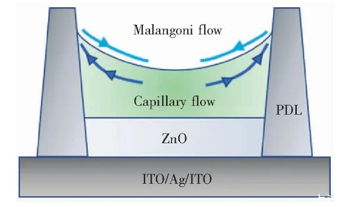量子點的成膜形貌與墨水配方密切相關。與平面上成膜容易產生咖啡環(huán)類似,在像素結構中量子點容易形成邊緣堆積的薄膜形貌。為了使量子點從邊緣遷移到像素坑中心,需要增大液滴內部自外而內的馬蘭戈尼流。
