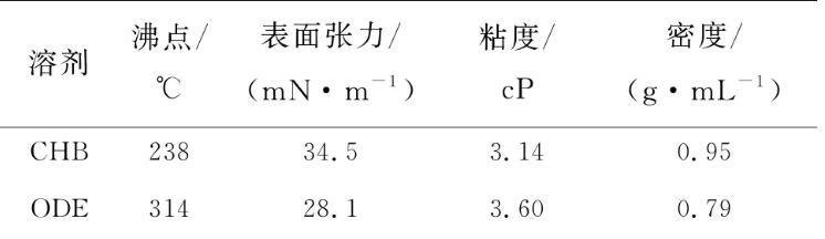 表1為CHB和ODE的沸點、表面張力等物理參數(shù),在選擇量子點溶劑時,利用了雙溶劑體系增強馬蘭戈尼流的基本原理。CHB是一種沸點較低、表面張力較高的溶劑,而ODE則是沸點高、表面張力低的溶劑,可以有效地增強自外而內的馬蘭戈尼流;同時兩種溶劑的粘度都較低,并且對量子點都有較好的溶解性。
