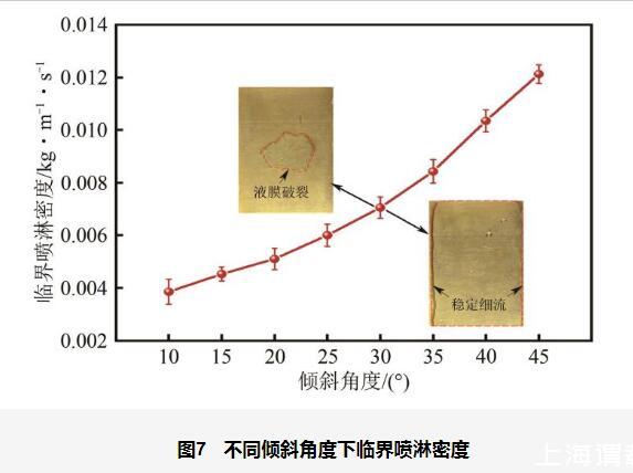 從圖7中可以看出,在較低的傾斜角度(如10°~25°)下,液膜受重力在壁面平行方向分量的影響較小,主要依靠噴淋液體的動(dòng)能和潤(rùn)濕性來(lái)維持覆蓋。此時(shí),液膜較厚,表面張力對(duì)毛細(xì)波動(dòng)的抑制作用較強(qiáng),能夠有效抵御擾動(dòng),流動(dòng)較為穩(wěn)定,因此臨界噴淋密度較低。然而,在較高的傾斜角度(如30°~45°)下,重力在流動(dòng)方向的分量顯著增強(qiáng),液膜受到更大的重力驅(qū)動(dòng)力作用,易發(fā)生滑移和局部脫離壁面現(xiàn)象。同時(shí),傾斜角度增大會(huì)使液膜變薄,液膜內(nèi)剪切力增大,進(jìn)一步放大表面張力波動(dòng)對(duì)擾動(dòng)的響應(yīng),從而導(dǎo)致液膜對(duì)擾動(dòng)的敏感性提高,流動(dòng)不穩(wěn)定性顯著增強(qiáng)。此外,局部區(qū)域的液膜破裂會(huì)導(dǎo)致液膜整體失穩(wěn),最終在兩側(cè)形成穩(wěn)定細(xì)流。因此,為了維持液膜的完整性和連續(xù)性,需要提高噴淋密度以抵消重力和表面張力波動(dòng)的破壞作用,從而導(dǎo)致臨界噴淋密度在高傾斜角度下顯著升高。