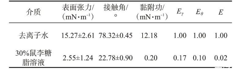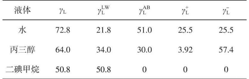 基于接觸角測(cè)量法中的LW-AB法,參考韓玉香等的研究,首先分別測(cè)試3種溶液(去離子水、丙三醇和二碘甲烷)在親油玻片及30%鼠李糖脂溶液處理后的親油表面的接觸角;然后結(jié)合3種溶液的表面張力及其分量值(表1),按照參考文獻(xiàn)中式1-38至式1-42,分別測(cè)算固體的表面能中Lifshits-van der waals分量、以及Lewis酸分量和堿分量;最后按照參考文獻(xiàn)中式1-37計(jì)算親油玻片及30%鼠李糖脂溶液處理后的親油表面自由能γS。
