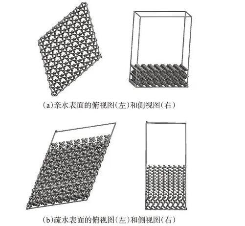 SiO2(001)元胞表面羥基化后,用十八烷基三氯硅烷(OTS)取代羥基進(jìn)行硅烷化處理,并通過(guò)構(gòu)建超胞得到擴(kuò)展表面。為消除周期邊界條件的影響,在表面添加35?真空層,得到SiO2疏水表面初始模型。優(yōu)化后的疏水表面結(jié)構(gòu)如圖1(b)所示,OTS的長(zhǎng)鏈烷基在表面呈輕微傾斜的垂直規(guī)律排布。