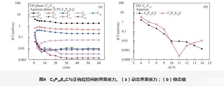一般而言,為了實(shí)現(xiàn)超低界面張力,需要表面活性劑分子同時滿足親水親油平衡和尺寸匹配兩個條件。表面活性劑分子在油相和水相有著近乎相等的分配能力時,稱為親水親油平衡狀態(tài),此時表面活性劑在界面上吸附量最大。油分子烷烴碳數(shù)的變化會影響表面活性劑分子的親水親油平衡,當(dāng)測定表面活性劑溶液與系列正構(gòu)烷烴組成的體系的油水界面張力時,可能出現(xiàn)表面活性劑與某種正構(gòu)烷烴體系的油水界面張力最低。此正構(gòu)烷烴碳數(shù)稱為該表面活性劑的nmin,該nmin值反映了表面活性劑在水相與油相中的相對分配能力。當(dāng)nmin值越大,表面活性劑親油性越強(qiáng);反之,若nmin值越小,表面活性劑親水性越強(qiáng)。當(dāng)表面活性劑的nmin值與烷烴的碳原子數(shù)相等時,表面活性劑達(dá)到親水親油平衡。