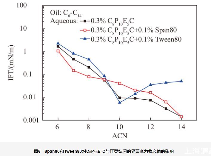 從圖中可以看出,由于Span80是油溶性很強的非離子表面活性劑,其在水中溶解性不好,只能與C8P10E5C分子形成混合膠束。因此,Span80不會影響C8P10E5C的親水親油平衡,表現(xiàn)為混合體系的nmin值與單獨C8P10E5C相似。同時,Span80會分配到油相中,然后從油相一側(cè)向界面吸附。這就造成油相烷烴碳數(shù)較低、界面張力較高時,Span80通過混合吸附,輕度降低界面張力;而當油相烷烴碳數(shù)較高、界面張力較低時,Span80通過競爭吸附,造成界面張力略有升高。但總體而言,油溶性非離子表面活性劑對界面張力影響不大。