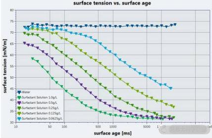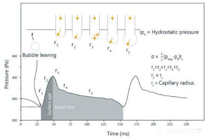 測(cè)量結(jié)果對(duì)應(yīng)的是一定表面年齡下的表面張力,表面年齡為從氣泡開(kāi)始產(chǎn)生到最大壓力之間的時(shí)間。表面張力對(duì)表面年齡的關(guān)系可以通過(guò)不同的鼓泡速度測(cè)出。