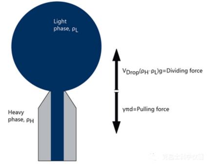 由于界面張力γ的作用,液滴試圖在體相中保持盡可能小的界面。當(dāng)液滴從毛細(xì)管上脫落時(shí),新的界面產(chǎn)生,這需要克服相應(yīng)的界面張力,液滴直到舉升力能夠補(bǔ)償毛細(xì)管潤(rùn)濕長(zhǎng)度上的界面張力時(shí)才會(huì)脫落,關(guān)系式如下:g=重力加速度,V=液滴體積,d=毛細(xì)管內(nèi)徑,Δp=兩相密度差