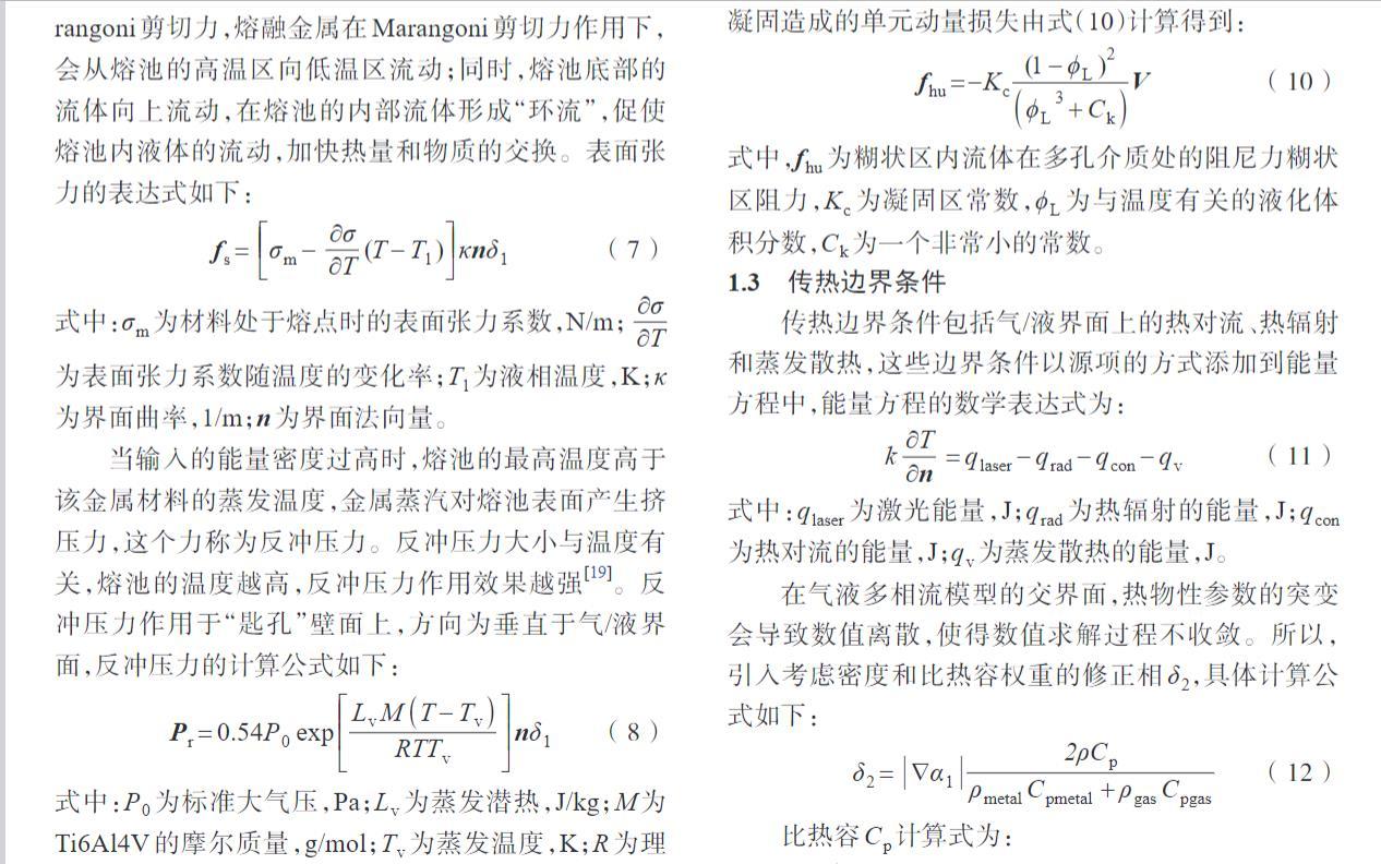 當(dāng)輸入的能量密度過高時(shí),熔池的最高溫度高于該金屬材料的蒸發(fā)溫度,金屬蒸汽對熔池表面產(chǎn)生擠壓力,這個力稱為反沖壓力。反沖壓力大小與溫度有關(guān),熔池的溫度越高,反沖壓力作用效果越強(qiáng)。反沖壓力作用于“匙孔”壁面上,方向?yàn)榇怪庇跉?液界面,反沖壓力的計(jì)算公式如下:
