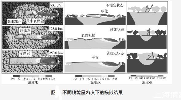 為分析線能量密度對球化缺陷形成機(jī)理的影響,選取激光功率150 W,線能量密度分別為83.3 J/m、125.0 J/m和250.0 J/m的3組參數(shù)進(jìn)行數(shù)值模擬,結(jié)果如圖2所示。當(dāng)線能量密度為83.3 J/m時(shí),部分熔融金屬凝固并與周圍粉末黏附成球;部分熔融金屬在表面張力的驅(qū)使下傾向于減少表面能,迅速地成球;這兩種成球方式往往共同出現(xiàn)。這是因?yàn)榧す獾拇┩干疃葲]有到達(dá)基板,此時(shí)接觸角為180°,呈現(xiàn)不完全濕潤狀態(tài),液態(tài)金屬流動受阻,因此不能在基板上鋪展。當(dāng)線能量密度提高到125.0 J/m時(shí),單道由球化形態(tài)向斷續(xù)態(tài)過渡,雖然表面還比較粗糙,但是球化效應(yīng)明顯減弱,此時(shí)激光穿透深度剛剛到達(dá)基板,接觸角約為90°。當(dāng)線能量密度繼續(xù)提高到250.0 J/m時(shí),熔化的金屬粉末形成充足的熔融金屬,從而改善其流動性,凝固后獲得高度均勻和連續(xù)的單道,激光穿透深度能夠穿透粉末床并熔化基板,并且接觸角大于90°。因此,球化缺陷的形成機(jī)理可以總結(jié)為能量密度太低,熔融金屬不能在基板上鋪展。判斷是否球化最直接的依據(jù)是觀察熔池深度是否穿透粉末層厚,并熔化了基板,也可以計(jì)算熔池的接觸角是否小于90°來判斷熔池的濕潤性。此外,還可通過適當(dāng)提高線能量密度,提高熔融金屬的流動性,以獲得更均勻和連續(xù)的單道。