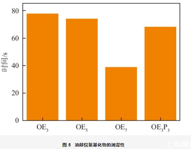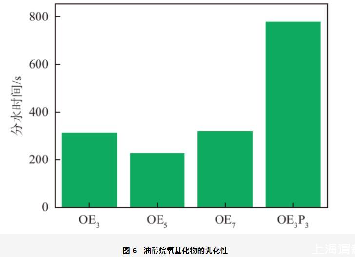 乳液是是熱力學(xué)不穩(wěn)定體系,乳液穩(wěn)定性可以通過測定發(fā)生乳化作用后分出一定體積水所需時(shí)間來表示,分水時(shí)間越長,乳化性能越好。油醇烷氧基化物的乳化性如圖6所示。OE3、OE5和OE7乳化液體石蠟的分水時(shí)間分別為313,228和319 s。當(dāng)OEn中EO加合數(shù)由3增加到5時(shí),其分水時(shí)間明顯降低,乳化性降低。這是因?yàn)镋O基團(tuán)為親水基團(tuán),當(dāng)EO基團(tuán)增加時(shí),表面活性劑分子的親水性增加,與疏水性的液體石蠟相互作用減弱,乳化性降低。當(dāng)EO加合數(shù)由5繼續(xù)增加到7時(shí),其分水時(shí)間又顯著增大,乳化性增強(qiáng)。這是因?yàn)楫?dāng)EO基團(tuán)的加合數(shù)較大時(shí),EO基團(tuán)具有一定的疏水性,表面活性劑分子與液體石蠟相互作用增強(qiáng),乳化能力提高。從圖中還可以看出,當(dāng)在OE3中引入PO基團(tuán)后,OE3P3乳化液體石蠟的分水時(shí)間為778 s,乳化性顯著增強(qiáng),這是因?yàn)镻O基團(tuán)是疏水性基團(tuán),且具有一定的支化結(jié)構(gòu),當(dāng)分子中引入PO基團(tuán)后,使其更容易“插入”油相,增強(qiáng)表面活性劑分子與油相液體石蠟之間的相互作用,乳化性顯著增強(qiáng)。