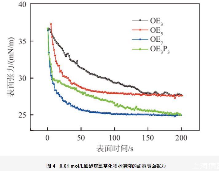 圖4為0.01 mol/L油醇烷氧基化物的動(dòng)態(tài)表面張力。從圖4中可以看出,相同表面時(shí)間時(shí)油醇烷氧基化物動(dòng)態(tài)表面張力的大小順序?yàn)椋篛E3>OE5>OE3P3>OE7,即其降低水的表面張力的能力順序?yàn)椋篛E3<OE5<OE3P3<OE7。隨著OEn分子結(jié)構(gòu)中EO加合數(shù)的增加,其動(dòng)態(tài)表面活性增強(qiáng);在OE3分子中引入PO基團(tuán)可以提高其動(dòng)態(tài)表面活性。這與李本鋼等人報(bào)道的“親水基團(tuán)相同時(shí),表面活性劑分子親油性越強(qiáng),動(dòng)態(tài)表面活性越高”是一致的。從圖4還可以看出,當(dāng)表面時(shí)間為3 s時(shí),油醇烷氧基化物的動(dòng)態(tài)表面張力為36~37 mN/m,該值顯著低于相同濃度、相同表面時(shí)間時(shí)C12EO6和C12EO8的動(dòng)態(tài)表面活性(60 mN/m),這可能是由于油醇烷氧基化物具有較強(qiáng)的疏水性所致;另外,該值也顯著低于相同濃度、相同表面時(shí)間時(shí)陰離子表面活性劑OEnS(n=3,5,7)的動(dòng)態(tài)表面張力(65 mN/m),這是因?yàn)榉请x子表面活性劑分子的吸附勢壘小于離子型表面活性劑。