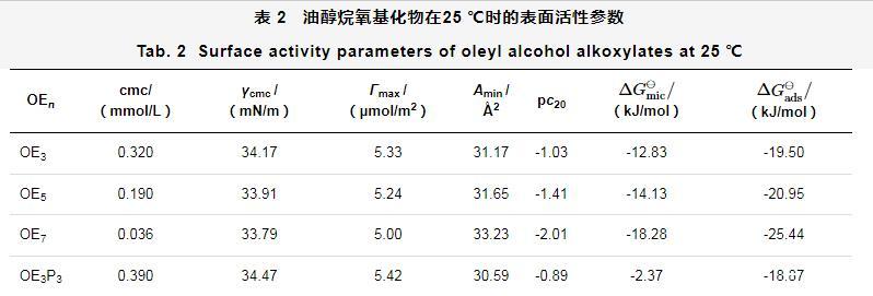 表2油醇烷氧基化物在25℃時(shí)的表面活性參數(shù)