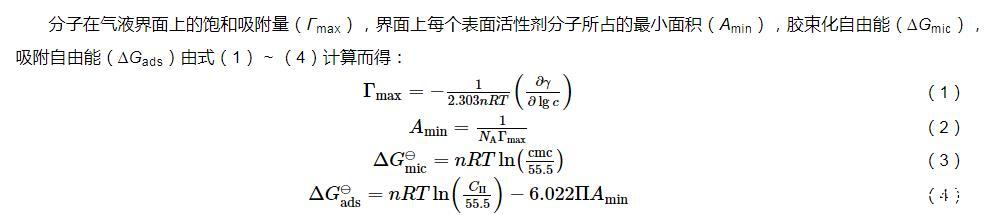 分子在氣液界面上的飽和吸附量(Γmax),界面上每個(gè)表面活性劑分子所占的最小面積(Amin),膠束化自由能(?Gmic),吸附自由能(?Gads)由式(1)~(4)計(jì)算而得: