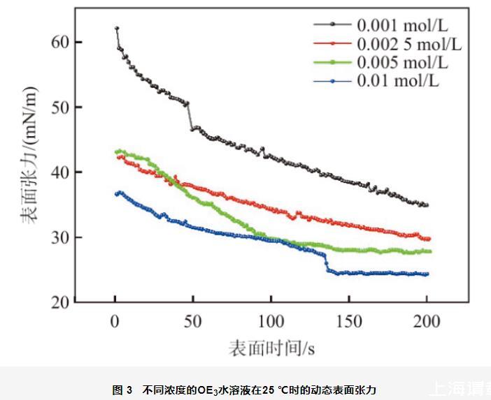 圖3不同濃度的OE3水溶液在25℃時(shí)的動(dòng)態(tài)表面張力
