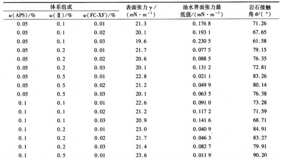 從圖4和圖5中也可以看出,當(dāng)Ⅱ型潤濕劑質(zhì)量分?jǐn)?shù)為0.2%、APS質(zhì)量分?jǐn)?shù)在0.05%~0.20%之間、FC-XF質(zhì)量分?jǐn)?shù)在0.01%~0.03%之間時混合體系具有更高的界面活性。因此,選擇APS質(zhì)量分?jǐn)?shù)為0.05%、0.10%和0.20%,Ⅱ型潤濕劑質(zhì)量分?jǐn)?shù)為0.1%、0.2%和0.5%,F(xiàn)C-XF質(zhì)量分?jǐn)?shù)為0.01%、0.02%和0.03%進(jìn)行三因素三水平的正交實驗,考察APS/Ⅱ/FC-XF混合體系的界面性能及與巖石的接觸角,結(jié)果如表1所示。