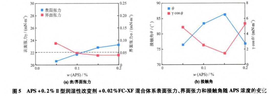 從圖5(a)中可以看出,隨著APS質(zhì)量分?jǐn)?shù)的增加,體系的表面張力增大,界面張力減小,這與FXCF對表/界面張力的影響機(jī)制相同。從圖5(b)中可以看出,隨著APS質(zhì)量分?jǐn)?shù)的增加,體系與巖石的接觸角先增加再減小,相應(yīng)的γcosθ先減小再增大,均出現(xiàn)極值點,這與圖4(b)的變化趨勢不同。這是因為吸附Ⅱ型潤濕性改變劑和FC-XF使得巖石表面由水濕轉(zhuǎn)變?yōu)槿跤H水性潤濕(接觸角<75°),更易于吸附APS的親水頭基而使碳?xì)滏溤趲r石表面暴露,這降低了巖石表面的親水性,因而隨著APS質(zhì)量分?jǐn)?shù)的增加接觸角增大。但是,當(dāng)APS質(zhì)量分?jǐn)?shù)大于0.15%后,過多的APS分子可能在巖石表面發(fā)生雙分子層吸附或因競爭吸附而降低Ⅱ型潤濕性改變劑的吸附量,使得巖石表面的親水性增加。而且,接觸角的變化決定了γcosθ的變化趨勢,因而接觸角和γcosθ隨APS質(zhì)量分?jǐn)?shù)的變化曲線中均出現(xiàn)極值點。