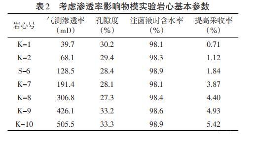 2.3.3評(píng)價(jià)滲透率對(duì)微生物驅(qū)油的影響