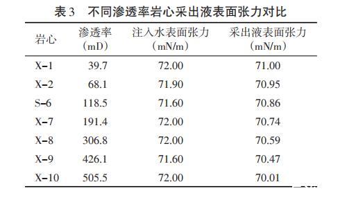 表4不同滲透率巖心采出液界面張力對(duì)比