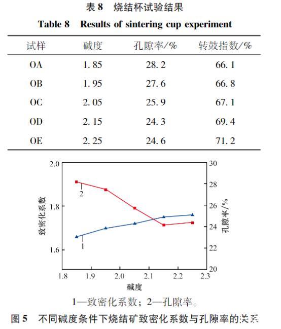 從表9可以看出,在堿度為1.85~2.15范圍內(nèi),隨著堿度的提高,燒結(jié)礦的孔隙率呈不斷降低趨勢,其轉(zhuǎn)鼓指數(shù)不斷增大,燒結(jié)礦強(qiáng)度增大。當(dāng)堿度達(dá)到2.25時,相比前一堿度2.15,孔隙率略有增加,轉(zhuǎn)鼓指數(shù)稍有下降。原因可能是當(dāng)堿度逐漸提高超過一定值(>2.15),燒結(jié)礦內(nèi)逐漸產(chǎn)生更多硅酸二鈣晶型轉(zhuǎn)變引起的氣孔與微裂紋,透氣性反而略有提高,孔隙率反彈微升。