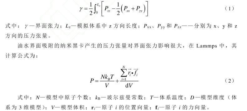 油水界面吸附的納米黑卡產(chǎn)生的壓力張量對界面張力影響很大,在Lammps中其計算公式為: