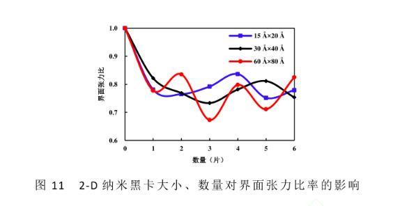 圖11 2-D納米黑卡大小、數(shù)量對界面張力比率的影響