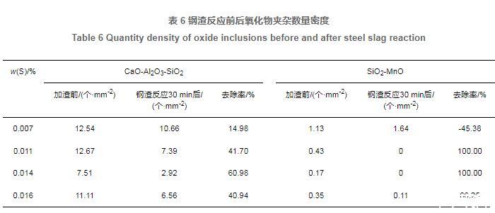 分析鋼渣反應(yīng)前后夾雜物的成分可知,重軌鋼中氧化物夾雜分為SiO2-MnO系和CaO-Al2O3-SiO2系兩類夾雜,圖8所示為兩類典型夾雜二維形貌。各類氧化物夾雜在鋼渣反應(yīng)前后數(shù)量密度變化見(jiàn)表6??梢钥闯觯撝兄饕獖A雜為鈣鋁硅酸鹽,因此鋼渣反應(yīng)30 min后,鈣鋁酸鹽的去除率同總氧化物夾雜的去除率相近,隨著氧、硫質(zhì)量分?jǐn)?shù)的增高,鈣鋁酸鹽的去除率呈升高的趨勢(shì)。由于鋼中硅錳夾雜數(shù)量較少,且掃描面積有限,僅從以上表格統(tǒng)計(jì)的數(shù)量密度不具代表性,因此其去除率未呈現(xiàn)明顯規(guī)律。