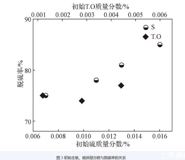 檢測(cè)每爐試樣1和試樣2的硫和全氧質(zhì)量分?jǐn)?shù),結(jié)果見(jiàn)表3??梢钥闯?,固定鋼中全氧質(zhì)量分?jǐn)?shù),隨著初始硫質(zhì)量分?jǐn)?shù)的升高,鋼渣反應(yīng)30 min后,脫硫率逐漸增大,且穩(wěn)定在74%以上,終點(diǎn)硫質(zhì)量分?jǐn)?shù)可降低到0.002 6%以下;固定鋼中硫質(zhì)量分?jǐn)?shù),隨著初始全氧質(zhì)量分?jǐn)?shù)的升高,終點(diǎn)全氧質(zhì)量分?jǐn)?shù)可降低到0.001 4%以下,終點(diǎn)硫質(zhì)量分?jǐn)?shù)可降低到0.001 8%以下,皆滿足重軌鋼的成分要求。鋼中初始硫、全氧質(zhì)量分?jǐn)?shù)與脫硫率的關(guān)系如圖3所示。
