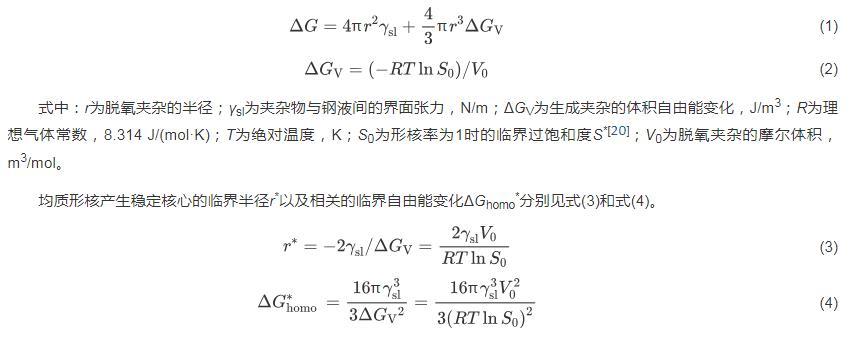實(shí)際煉鋼脫氧的過(guò)程中,新相形核是以均質(zhì)形核和非均質(zhì)形核2種方式進(jìn)行的。脫氧生成1個(gè)半徑為r的球形夾雜時(shí),總自由能的變化為ΔG,在數(shù)值上為生成新相產(chǎn)生的表面能和引起體積變化的自由能之和[20],見(jiàn)式(1)。生成夾雜的體積自由能變化ΔGV見(jiàn)式(2)。