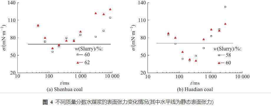 不同質(zhì)量分?jǐn)?shù)水煤漿表面張力的變化情況如圖4所示。可以看出:不同條件下水煤漿的動(dòng)態(tài)表面張力變化情況比較一致,隨著特征氣泡時(shí)間(t)的增加,動(dòng)態(tài)表面張力均先減小后增加,在氣泡特征時(shí)間為200 ms附近出現(xiàn)最小值;而水煤漿的動(dòng)態(tài)表面張力與靜態(tài)表面張力存在顯著差異,在氣泡特征時(shí)間較小或較大時(shí),動(dòng)態(tài)表面張力均大于靜態(tài)表面張力。
