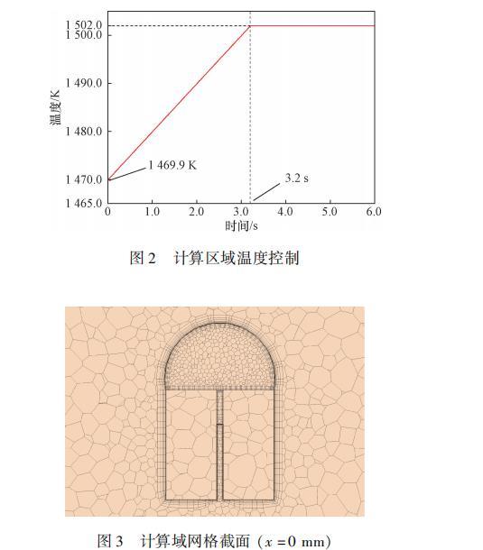 計算域網(wǎng)格截面(x=0mm)如圖3所示,整體上采用多面體網(wǎng)格,在釬料涂覆區(qū)域內外均設置邊界層網(wǎng)格,為準確捕捉多余釬料在母材表面的流失過程,對母材表面的網(wǎng)格進行加密。