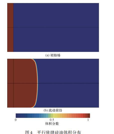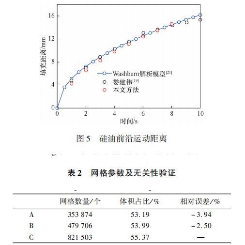 根據(jù)式(6)與式(7)可以看出,這類(lèi)由表面張力驅(qū)動(dòng)的流動(dòng)與邊界處接觸角緊密相關(guān)。為保證接觸角施加方法的正確性,對(duì)表面張力驅(qū)動(dòng)下的平行平板流動(dòng)進(jìn)行了計(jì)算,并將結(jié)果與前人的數(shù)值模擬結(jié)果進(jìn)行了對(duì)比。驗(yàn)證模型為15mm×8mm×0.4mm的平行平板,所采用材料為硅油,具體物性參數(shù)如表1所示。首先將平板前端部分區(qū)域內(nèi)充滿硅油,以此為初始場(chǎng)進(jìn)行計(jì)算[圖4(a)]。圖4(b)為計(jì)算一段時(shí)間后得到的流動(dòng)前沿,最終得到的前沿最大高度隨時(shí)間變化如圖5所示,計(jì)算結(jié)果與前人數(shù)值模擬結(jié)果及Washburn解析模型吻合良好,證明了基于VOF模型的數(shù)值方法計(jì)算硅油填充平板過(guò)程的準(zhǔn)確性。