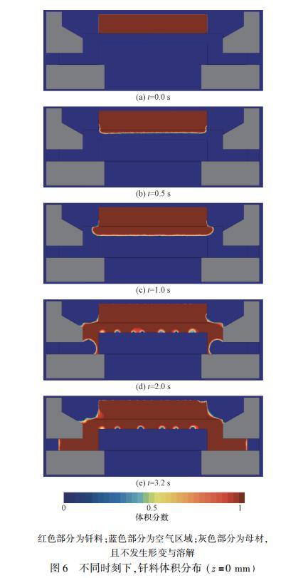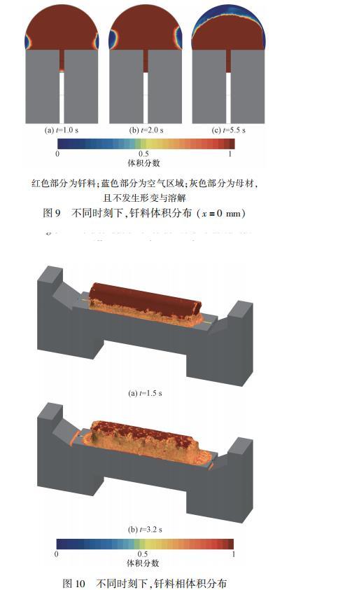為充分評(píng)估釬料填充焊縫的流動(dòng),給出了不同時(shí)刻下x=0mm截面處的釬料體積分布(圖9),截面兩側(cè)釬料融化過(guò)程基本呈對(duì)稱(chēng)分布。涂覆釬料從底部開(kāi)始融化,并不斷填充焊縫,兩側(cè)慢慢形成了“凹”形液面。隨著保溫過(guò)程進(jìn)行,釬料均融化為液態(tài),液態(tài)釬料在表面張力的作用下收縮為半球形狀。