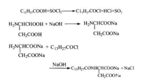 先合成十四酰氯和天冬氨酸鈉,然后再將十四酰氯與天冬氨酸鈉反應得到目標產(chǎn)物N-十四?;於彼徕c。