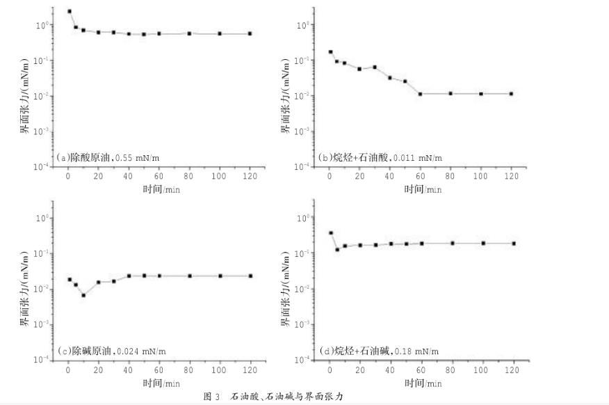 為研究遼河石油酸、石油堿與界面活性之間的關(guān)系,首先測(cè)量了遼河兩性表面活性劑與原油之間的界面張力,為0.005 2 mN/m,可以超低;也測(cè)量了表面活性劑與烷烴之間的界面張力,為1.38 mN/m,界面活性較差;在此基礎(chǔ)上考察石油酸、石油堿對(duì)降低界面張力的貢獻(xiàn)。由圖3可以看出,在原油剔除石油酸組分后,界面張力由超低陡然升高至0.55 mN/m,說(shuō)明石油酸組分對(duì)超低界面張力的形成具有非常重要的作用,也說(shuō)明在遼河油田的兩性表面活性劑二元復(fù)合驅(qū)中,石油酸組分依然發(fā)揮著原油活性物質(zhì)的作用;在烷烴組分添加石油酸后,界面張力由1.38 mN/m降低至0.011 mN/m,兩個(gè)數(shù)量級(jí)的降低,進(jìn)一步說(shuō)明石油酸組分與遼河兩性表面活性劑之間具有明顯的相互作用,是有效降低界面張力的重要原油組分。