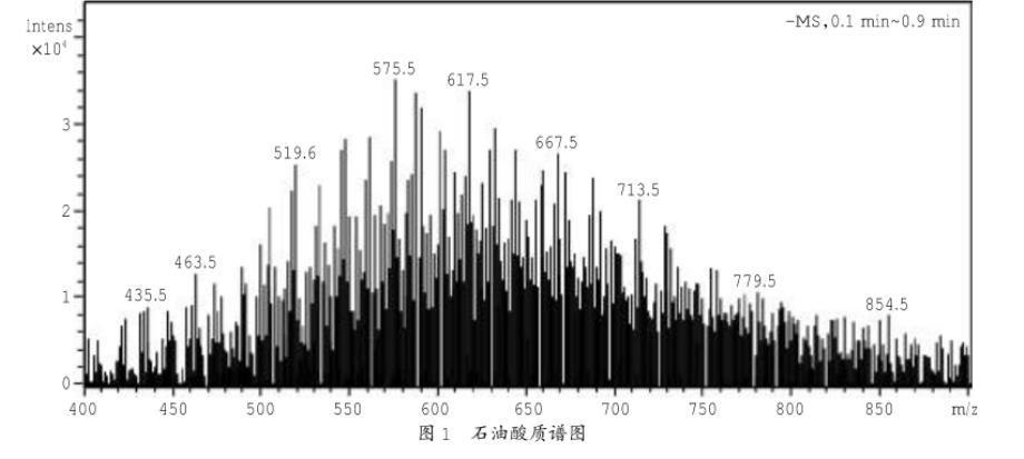 遼河原油石油酸的質(zhì)譜圖(見(jiàn)圖1),從圖1可以看出,石油酸相對(duì)分子質(zhì)量主要分布在400~900,且質(zhì)荷比大多數(shù)是奇數(shù),與石油酸根的相對(duì)分子質(zhì)量M=14n+45-2x相對(duì)應(yīng)。依據(jù)質(zhì)荷比計(jì)算石油酸的基本結(jié)構(gòu)信息,如:409對(duì)應(yīng)C27脂肪酸,407對(duì)應(yīng)C27單環(huán)烷酸,401對(duì)應(yīng)C27四環(huán)烷酸;605對(duì)應(yīng)C41脂肪酸,603對(duì)應(yīng)C41單環(huán)烷酸,601對(duì)應(yīng)C41雙環(huán)烷酸;599對(duì)應(yīng)C41三環(huán)烷酸,597對(duì)應(yīng)C41四環(huán)烷酸,595對(duì)應(yīng)C41五環(huán)烷酸,593對(duì)應(yīng)C41六環(huán)烷酸,591對(duì)應(yīng)C40脂肪酸;899對(duì)應(yīng)C62脂肪酸;可以確定遼河石油酸的碳數(shù)主要分布在C27~C62。對(duì)不同不飽和度的石油酸質(zhì)譜峰離子強(qiáng)度進(jìn)行歸一化,獲得不同類型石油酸的相對(duì)含量(見(jiàn)表3),可以看出環(huán)烷酸含量為86.58%,脂肪酸含量為13.42%。