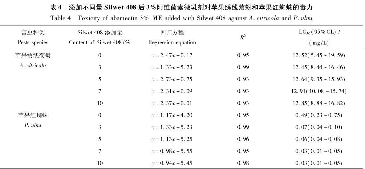 從表4中數(shù)據(jù)可看出:添加Silwet408可明顯提高阿維菌素微乳劑對(duì)蘋果紅蜘蛛的毒力,且隨助劑添加量的增加,藥劑LC50值降低;但添加Silwet408對(duì)阿維菌素微乳劑對(duì)蘋果繡線菊蚜的毒力并無(wú)明顯影響。說(shuō)明Silwet408雖能降低藥液的表面張力及在靶標(biāo)葉面的接觸角,促進(jìn)藥液在葉片上的潤(rùn)濕性,但并不一定能提高其對(duì)害蟲的毒力。