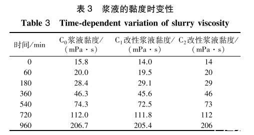 3種漿液在23℃條件下黏度隨時(shí)間變化關(guān)系見表3。可以看出:3種漿液的黏度均隨時(shí)間的增長(zhǎng)而逐漸變大,表面活性劑對(duì)漿液的初始黏度以及不同時(shí)間的黏度影響很小(最大變化≤1.8mPa·s)。說明加入表面活性劑對(duì)漿液的黏度變化無(wú)影響。