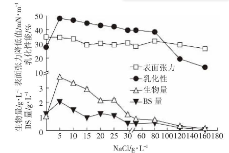 圖6 NaCl濃度對(duì)147細(xì)菌生長(zhǎng)以及生物表面活性劑產(chǎn)量的影響