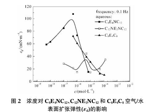 圖2濃度對(duì)C8E4NC12、C12NE3NC12和C8E4C8空氣/水表面擴(kuò)張彈性(εd)的影響
