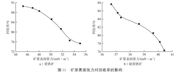 由圖11可知:礦漿表面張力與回收率之間存在顯著的負(fù)相關(guān)性,即礦漿表面張力的降低與黃鐵礦和磁黃鐵礦回收率的提高呈正相關(guān)。這一現(xiàn)象可歸因于礦漿表面張力在浮選過程中對泡沫形成及其穩(wěn)定性的影響。具體而言,降低礦漿表面張力可減少泡沫生成過程中的能量消耗,從而促進(jìn)泡沫的形成。同時,礦漿表面張力的降低亦可減小Plateau邊界與其他泡沫邊界間的壓力差,降低液膜厚度,減小破裂速率,增強泡沫穩(wěn)定性。因此,礦漿表面張力的降低對于提升黃鐵礦和磁黃鐵礦的回收率具有積極影響。