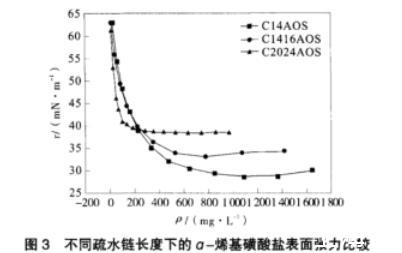 圖3不同疏水鏈長(zhǎng)度下的ɑ-烯基磺酸鹽表面張力比較
