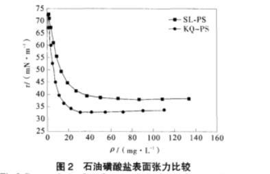 通過(guò)相關(guān)研究認(rèn)為,石油磺酸鹽在降低原油-水面張力方面具有優(yōu)良特性,被廣泛的應(yīng)用在石油驅(qū)油中。研究認(rèn)為以原油餾分與康醛抽出油因?yàn)樵牧铣煞植煌?,其表面張力也不同,具體如圖2所示。