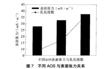 通過(guò)數(shù)據(jù)統(tǒng)計(jì)看出,AOS表面張力與乳化指數(shù)的關(guān)系則如圖7所示。