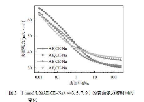 前面已經(jīng)討論了溶液平衡時的特性與規(guī)律,但沒有考慮平衡及老化的時間,而時間因素在實際應(yīng)用中起著決定性的作用。當(dāng)表面活性劑分子從本體相遷移到表面時,分子的動態(tài)吸附性能會影響表面活性劑的性能。因此,如圖3所示,測試了1 mmol/L的不同EO加合數(shù)的AEnCE-Na的表面張力隨時間的變化曲線。