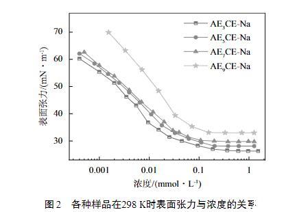 分子定向吸附到氣/液界面高效降低溶液的表面張力是表面活性劑的一大特性,表面張力的數(shù)據(jù)也是研究表面活性劑在界面的組成及自身的結(jié)構(gòu)和性能的基礎(chǔ)。因此,探究了不同EO加合數(shù)的AEnCE-Na的表面張力與濃度的關(guān)系,結(jié)果如圖2所示。由圖2可以看出,溶液的表面張力隨濃度的增大先急劇下降后基本保持不變,此外,還可以得到臨界膠束濃度(cmc)和臨界膠束濃度對應(yīng)的表面張力(γcmc)。表面活性劑分子在氣/液界面的最大吸附量(Γmax)、每個分子所占的最小截面積(Amin)及表面張力降低20 mN/m所需濃度的負(fù)對數(shù)(pc20)可以通過公式1)~3)計算得到。